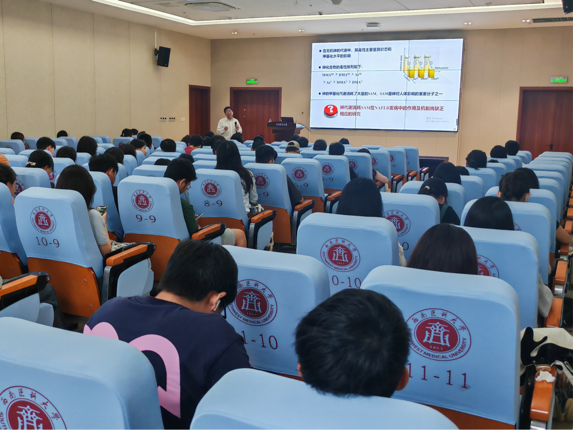 本次学术讲座,刘教授结合自身科研经历,进行题为“基于砷代谢探讨其所致非酒精性脂肪肝病的表观遗传机制及干预策略”的报告,主要围绕砷代谢消耗SAM如何影响m6A甲基化导致NAFL的发生?FAVB12对砷所致NAFLD是否具有保护作用?砷暴露与NAFLD风险在人群水平上的关系如何?三个问题展开阐述。他先介绍了砷暴露所致NAFLD机制,随后从多个维度阐述SAM是砷对人体影响的重要分子之一,引导大家思考砷代谢耗SAM在NAFLD发病中的作用及机制并从多角度分析砷暴露及砷代谢相关问题。