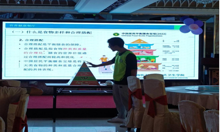 本次活动第一项,由蒋强同学对酒店管理人员、工作人员进行“中国居民平衡膳食宝塔(2022)”、“三减”政策的解读。使人们认识膳食营养结构,认识到合理搭配的重要性,以及让“少油、少盐、少糖”的饮食理念深入人心。