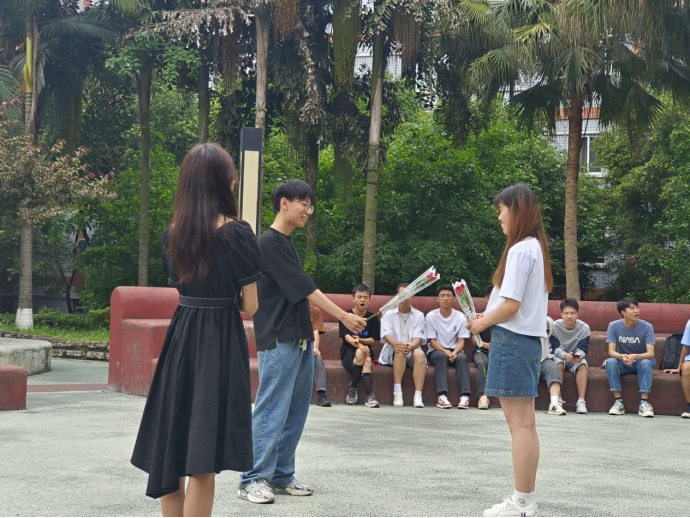 紧接着来到了最激动人心的环节——模拟表白。主持人经过“击鼓传花”,选出了六组同学进行现场模拟表白。同学们积极、热情的参与其中,天马行空的设计表白环节,勇敢跨出第一步,大声说出欣赏与爱慕,克服心理障碍,大胆表达好感,引导同学自信向上,停止不必要的内耗。