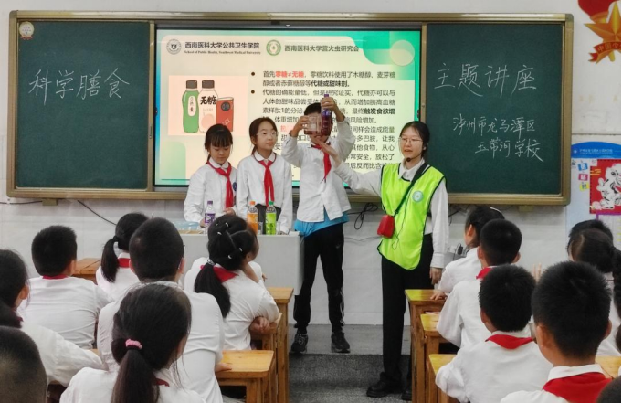 第二部分,志愿者们来到五年级十一班进行合理选择零食互动讲座,科普内容为少吃高盐、高糖、高脂的零食,多吃蛋白质、维生素含量丰富的零食,如:坚果,牛奶,水果等。志愿者利用有趣味的饮料色素实验和学生们互动,向学生们讲解含糖饮料的危害,同学们积极参与,使得科普活动顺利且有成效的完成。