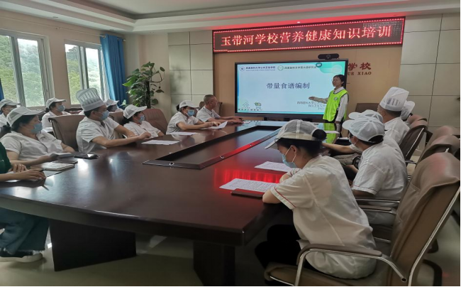 第三部分,志愿者们来到了食堂旁的会议厅利用通俗易懂的四川话对玉带河学校食堂的员工们进行了营养健康知识培训,包括带量食谱的编制:如何确定总能量,克数,配餐原则,菜品营养标签的制作,职工们都积极参与,认真学习,都想为学生们搭配出更加科学营养的饭菜出一份力。