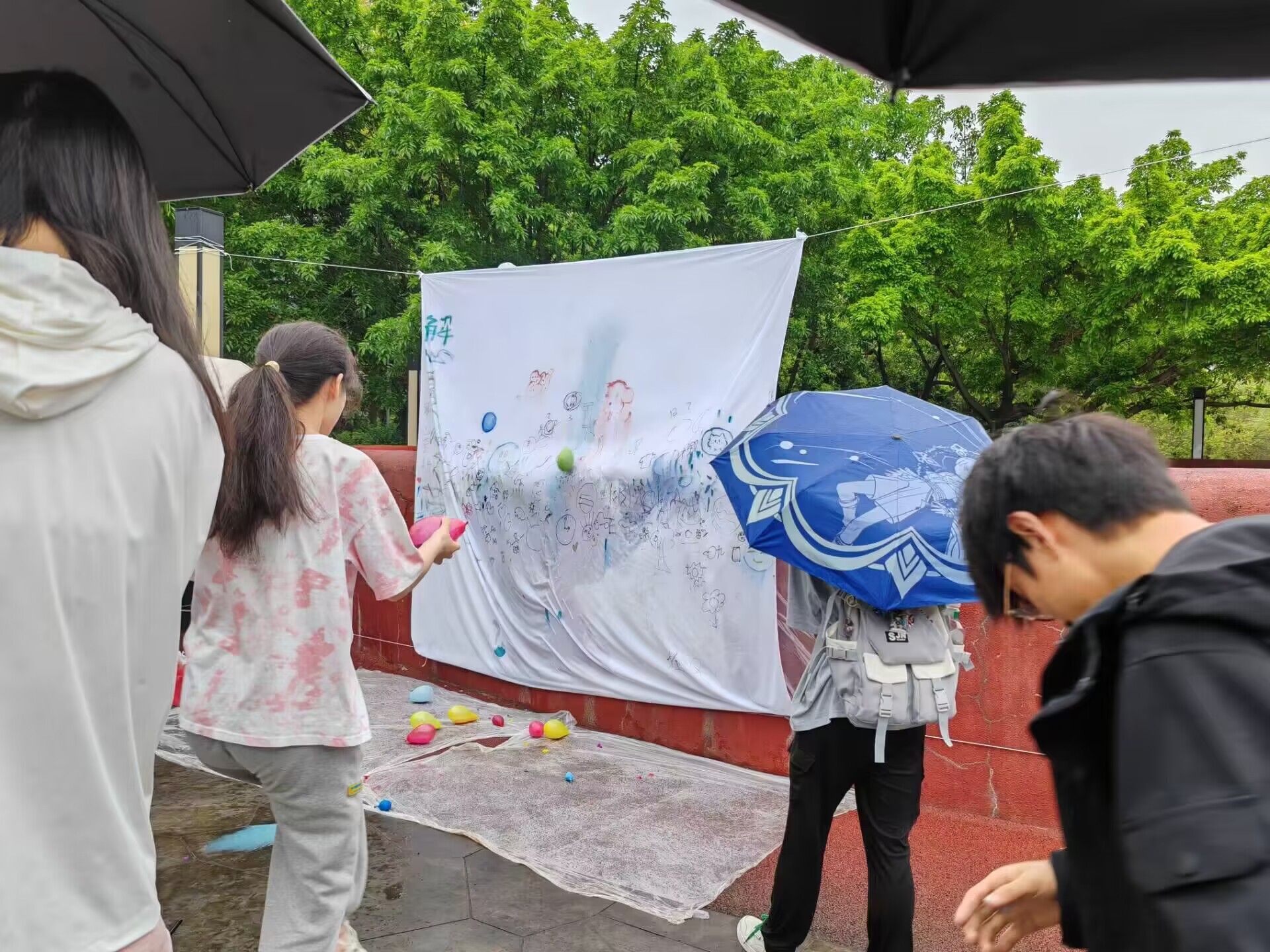 首先开展的是“你画我猜涂鸦营”,同学们通过自己的想象将主持人给的词语画在白布之上,在笔墨纷飞中展现自己的想象。其次开展的是“调色训练营”,我们将选取好的颜色画在白布上,同学们通过观察然后利用自己手中的颜料尽可能的调出与之相似的颜色。最后开展的是“坏情绪抛飞营”,同学们将颜料装进气球当中砸向白色的幕布上,随着气球的炸裂,烦恼也烟消云散,而留下来的不仅是五彩斑斓的颜色,也代表着更加美好的未来。
