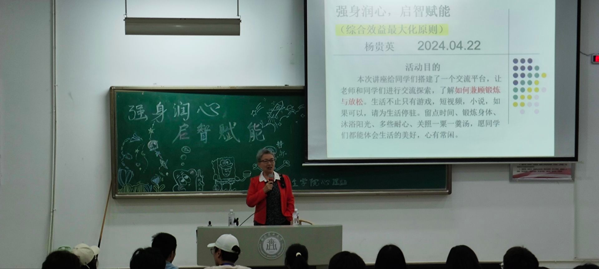 讲座开始,杨老师亲切地介绍自己为“开心”老师,并与同学们进行了亲切的互动,拉近了和同学们之间的距离。杨老师以自身经历为切入点,通过生动的案例和深入浅出的讲解,向同学们阐述了“综合效益最大化原则”,即强身是实现身心健康的基础,营养饮食是身体健康的关键,润心关注心理调适和精神成长。本次讲座得到了学生们的热烈响应和积极反馈。
