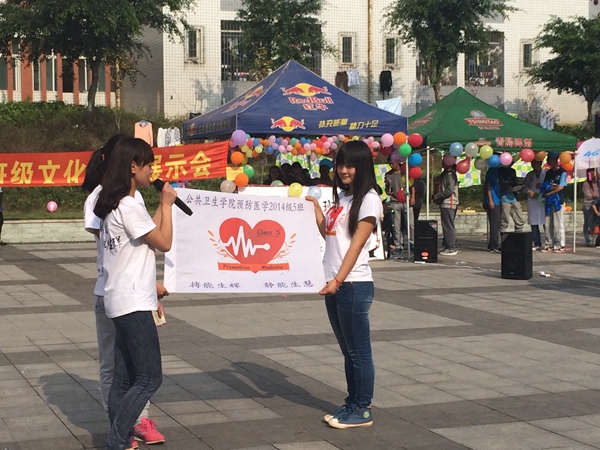 活动中2014级预防五个班,食品卫生与营养学两个班分别展示了本班的班徽、班训、班歌,同时穿插表演了班级同学自编自演的节目。火辣动感的舞蹈,欢乐搞笑的情景剧,轻柔动人的合唱都体现出同学的多才多艺,展现出班级的凝聚力。新颖的构思、精美的设计、巧妙的布置无不洋溢着浓浓的创新氛围。班级文化展示结束后,各班都组织了具有自己班级特色的游园活动,各种小游戏的穿插在欢乐的现场,将本次班级文化建设展示会推向了高潮。