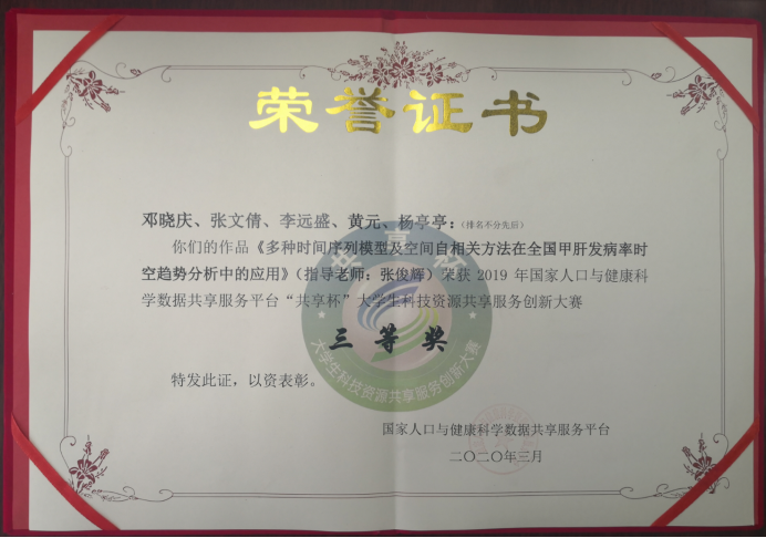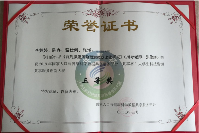 两项获奖作品分别为李姝婷、陈容、骆仕莉、张溪的《前列腺癌风险预测模型比较研究》和邓晓庆、张文倩、李远盛、黄元、杨婷婷的《多种时间序列模型及空间自相关方法在全国甲肝发病率时空趋势分析中的应用》。