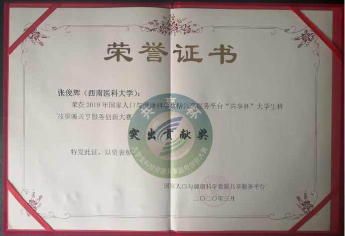 在近日结束的第七届“共享杯”大学生科技资源共享服务创新大赛(以下简称“共享杯”)中,我校华人策略社区官网网址预防医学本科生团队的两件作品荣获2019年国家人口与健康科学数据共享服务平台“共享杯”大学生科技资源共享服务创新大赛“三等奖”,团队指导老师张俊辉博士荣获共享杯“突出贡献奖”。