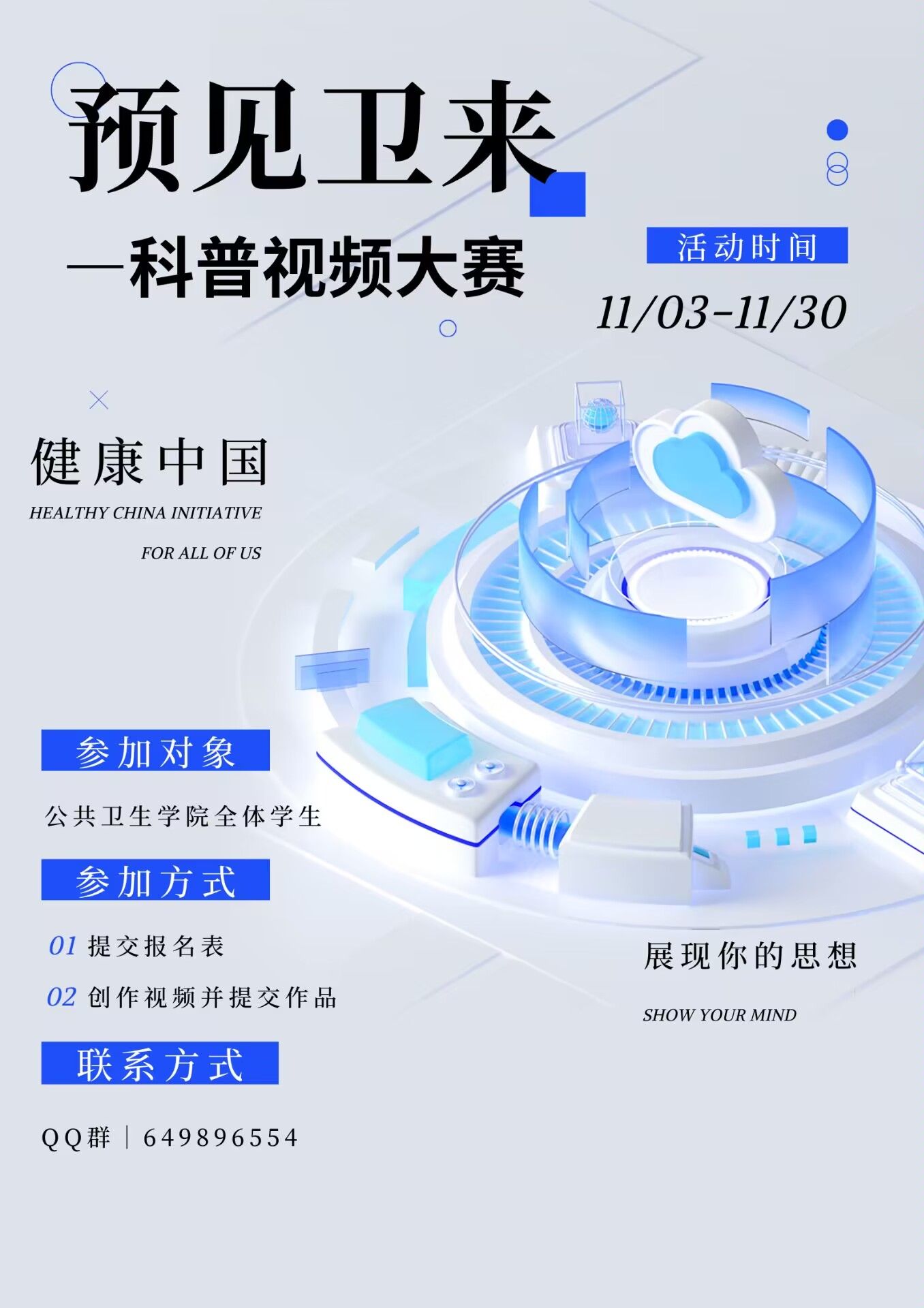 为响应建设健康中国的号召,引领青年学生投身健康中国行动,普及健康知识,宣传疾病预防手段,提高公众健康素质,推动卫生健康事业高质量发展,加快形成健康中国,建设人人参与、人人共享的社会环境氛围,华人策略社区官网网址特举办“预”见“卫”来·科普视频大赛。该比赛将于11月3日开始,11月30日止。