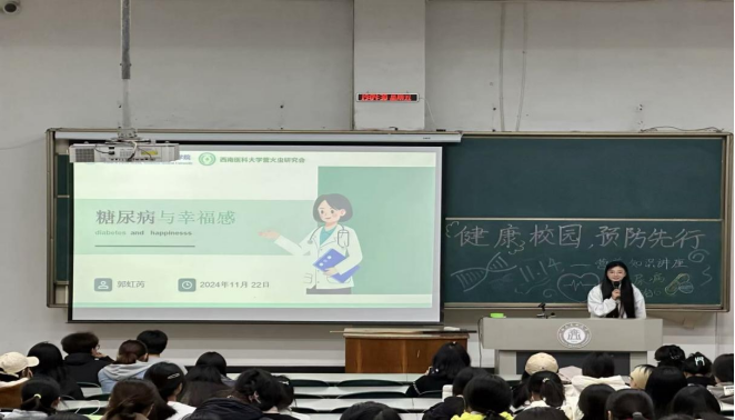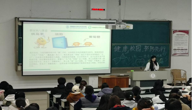 本次活动内容丰富多彩,包括视频播放、健康宣传、问答互动等环节。主持人郭虹芮同学对“什么是糖尿病”“糖尿病的危害及预防”以及“患者的健康管理”进行了讲解,向同学们传授实用的营养知识和健康生活方式,旨在促进大学生形成良好的饮食习惯,降低糖尿病风险。