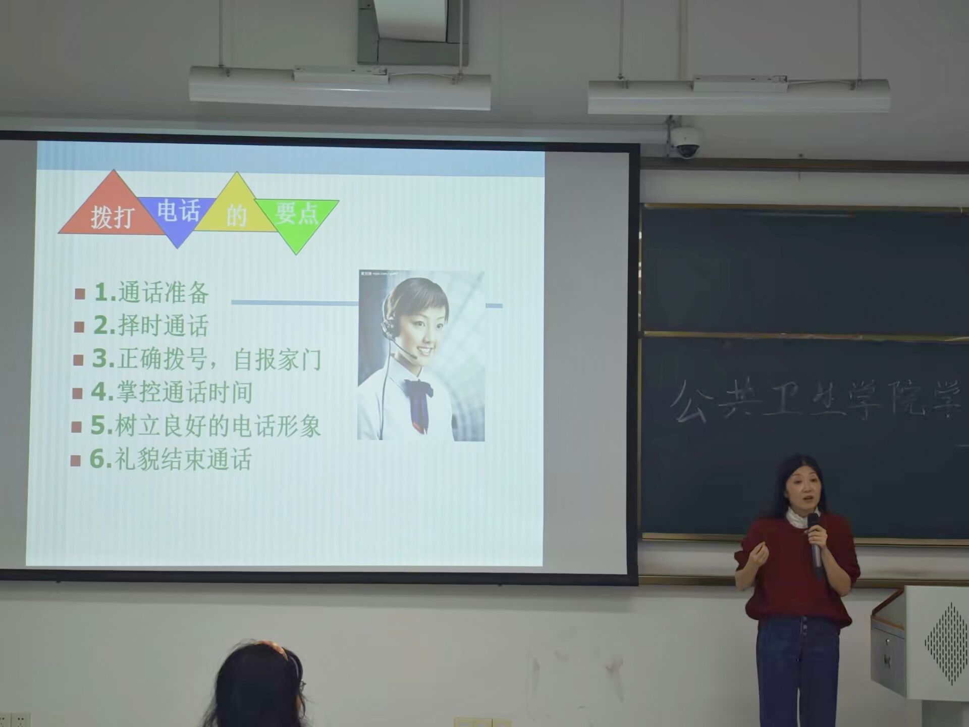 培训会上,彭丽冰以“中国式鞠躬礼仪”为切入点,深入阐释了礼仪的文化内涵与精神本质。通过解读《弟子规·出则悌》等经典篇目,引导学生从细节处体悟尊敬师长的传统美德,将礼仪内化于心,外化于行。此外,彭老师结合丰富实例,采用沉浸式情景模拟的方式,生动讲解了校园常见场合的礼仪规范、会务礼仪及座次安排等内容。整场讲解深入浅出,互动频繁,为同学们带来一场别开生面的礼仪知识盛宴。