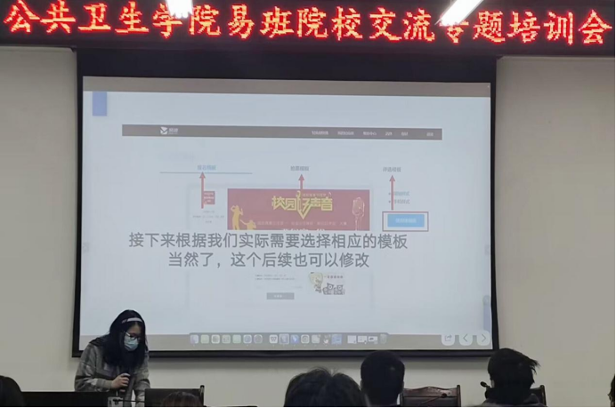 首先,由龚元锴同学进行发言,他为我们介绍了医学影像系易班分站结构、特色做法、院系优势及易班考核四个方面,为我们重点讲解了易班发帖的基本步骤,发帖安排和投稿等内容,并且与在场同学进行了提问交流。