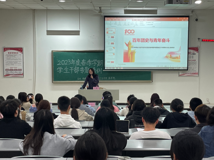 专题培训由马克思主义学院彭鎏佳教授主讲,彭鎏佳老师带领全体干部同学回顾中国共青团发展的百年光辉历程。1922年,在中国共产党直接领导下,中国共产主义青年团成立。中国共青团在百年间始终坚定不移跟党走,团结带领共青团员和广大青年前赴后继、勇当先锋,为党的建设培养德才兼备的可靠后备军,书写了中国青年百年的奋斗华章。彭鎏佳老师详细向全体干部同学介绍各阶段共青团发展的成就和变革,回顾百年团史,团结带领广大青年是共青团永不改变的初心和使命。