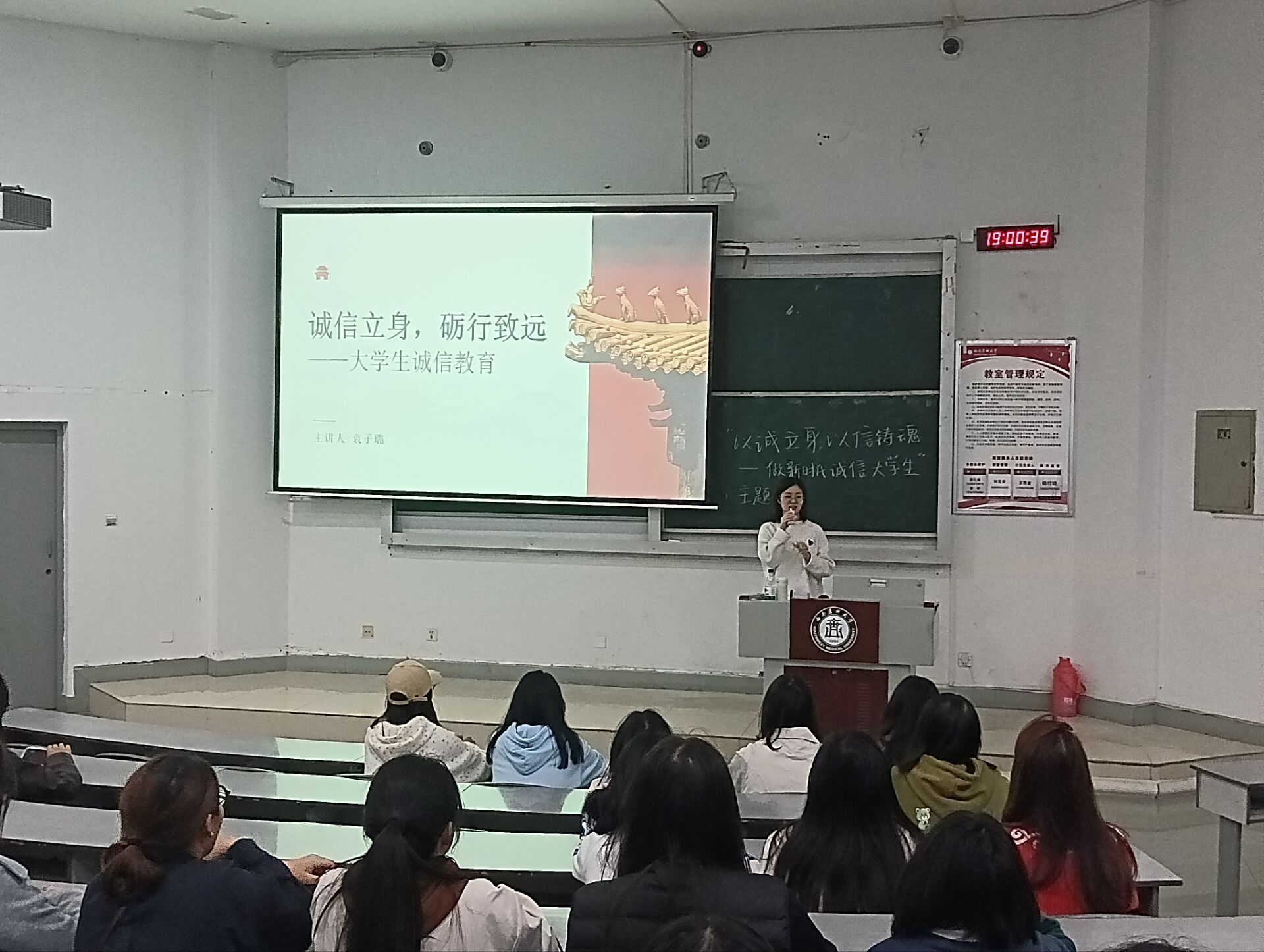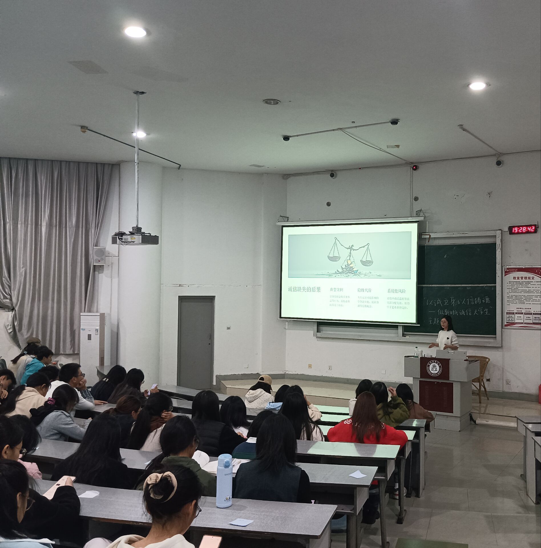 为引导同学们树立诚信意识,涵养诚信品格,争做新时代合格大学生,11月3日晚,华人策略社区官网网址在明理楼105教室举办了“以诚立身,以信铸魂”主题活动讲座。讲座由学生科辅导员袁子璐主讲,学院共一百余位同学参加。