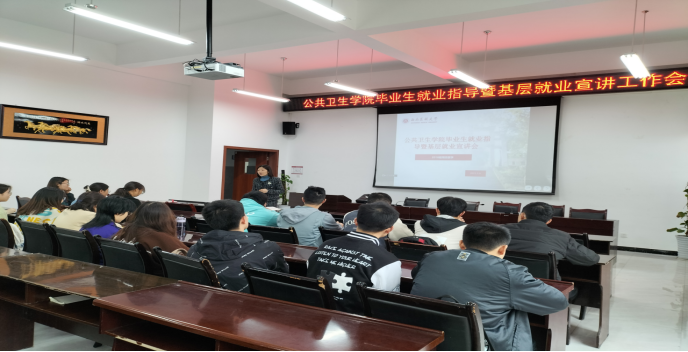 学生科甘雪辉老师就目前公共卫生领域的就业方向、就业平台和就业面试的注意事项做了相关的介绍,对三支一扶、西部计划相关政策进行宣讲。