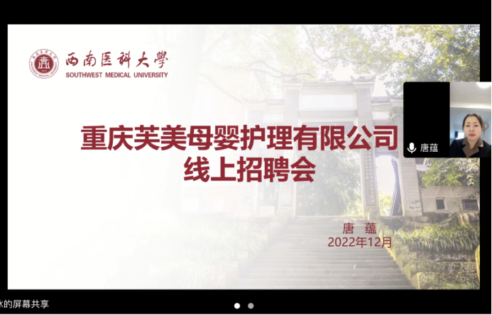 为拓宽我院食品卫生与营养学专业学生就业渠道,抓实就业服务,我院于22022年12月18日开展重庆芙美母婴护理有限公司专场线上招聘宣讲会,宣讲会由学生科科长彭丽冰主持,参加本次招聘会的毕业生共计23名。