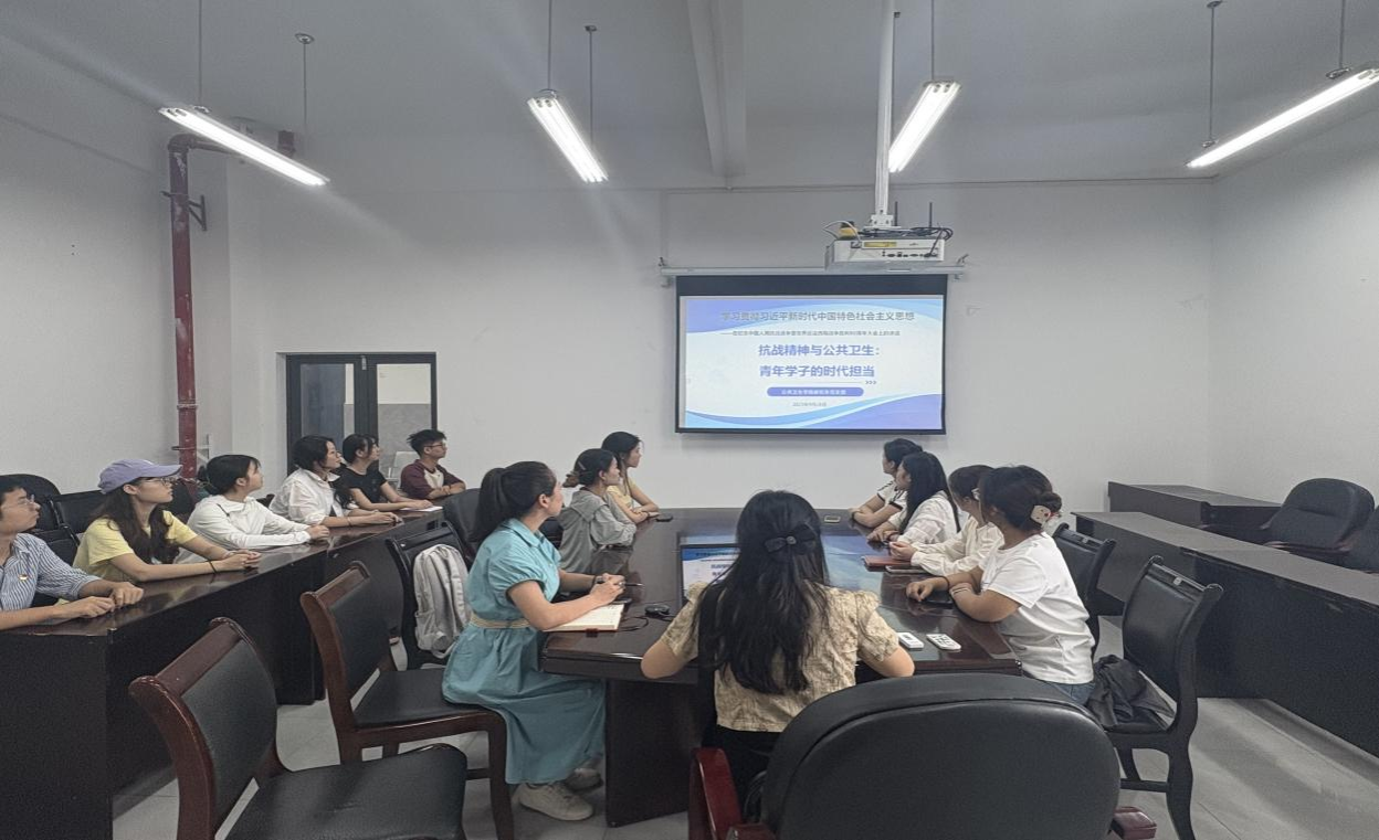 党支部书记伍虹飞组织支部党员深入学习贯彻习近平新时代中国特色社会主义思想,特别是习近平总书记在纪念中国人民抗日战争暨世界反法西斯战争胜利80周年大会上的重要讲话精神。详细解读抗战精神的内涵,强调青年学子应将抗战精神融入公共卫生实践,积极发挥党员先锋模范作用。