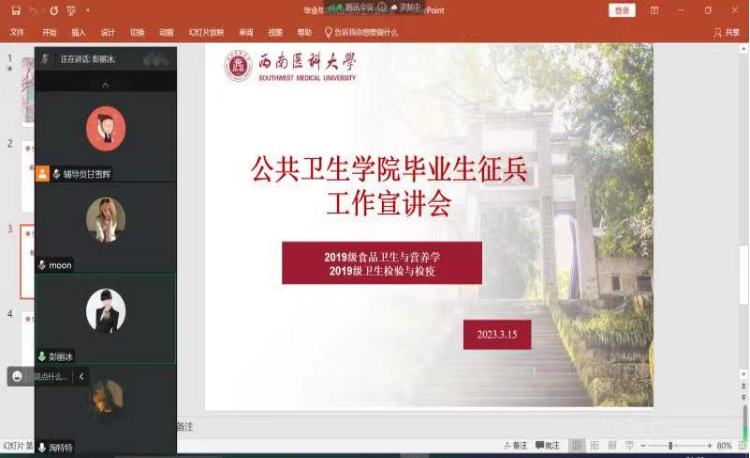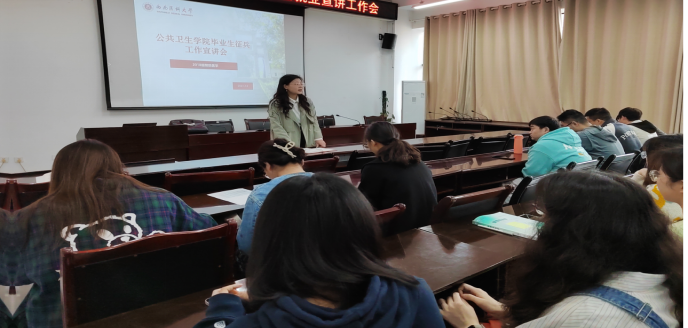 学生科甘雪辉老师主要就目前毕业生参军优势,做了相关的介绍,结合2016级预防医学学长的真实案例,鼓励毕业学生积极成为光荣的兵哥哥。