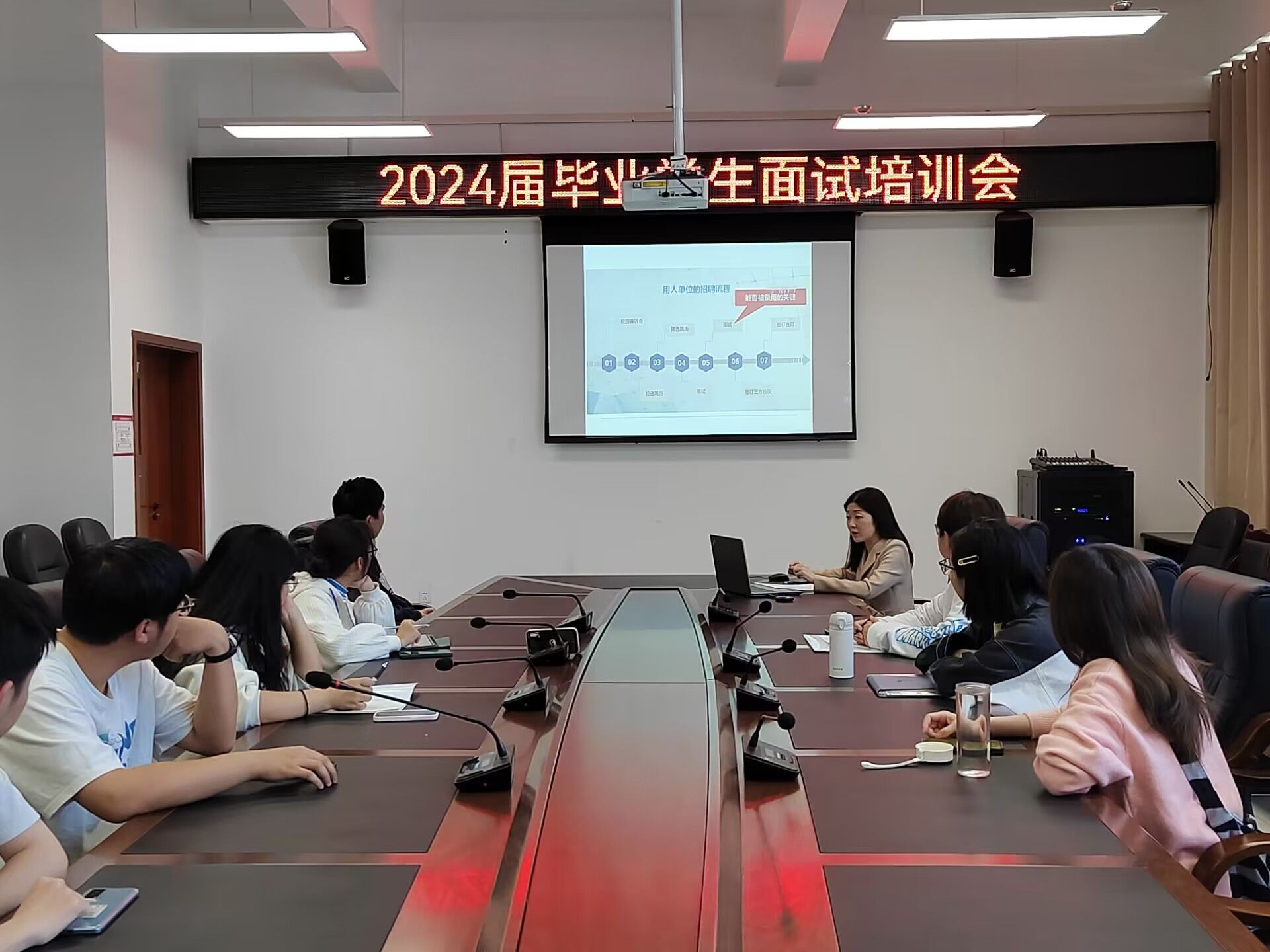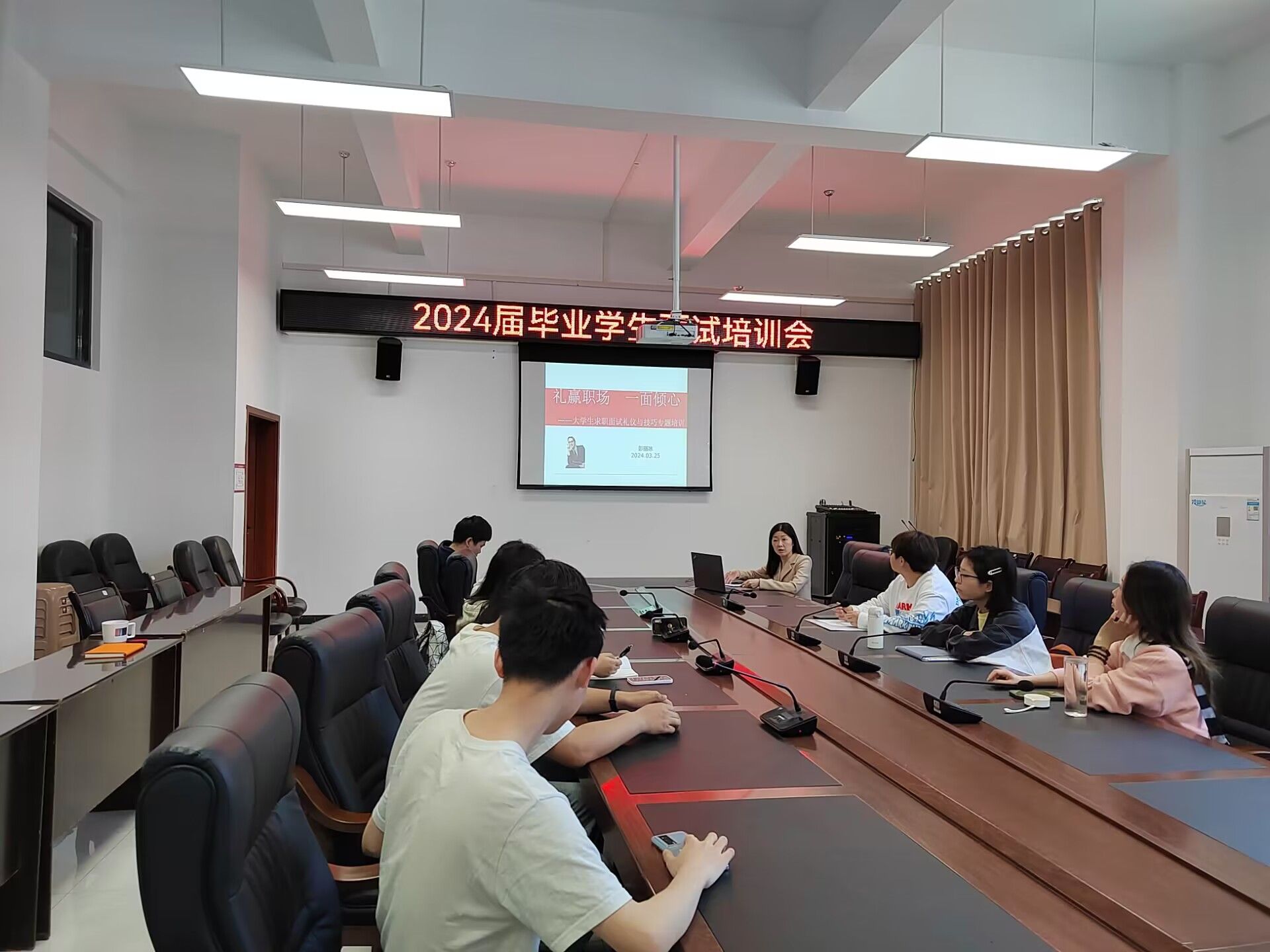 培训会上,彭丽冰老师就面试前的准备、面试过程中的沟通技巧、面试后的跟进等方面进行了详细的讲解和指导。彭老师指出毕业生们需要学会如何与面试官进行有效的沟通,并在有限的时间内充分展示自己的优势和特长。