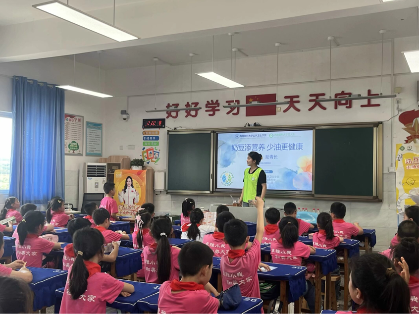 本次营养宣教分为“加奶”、“增豆”、“减油”三个部分。首先主讲人通过图文形式向同学们展示了6~10岁学龄儿童平衡膳食宝塔,并给出奶及奶制品每日建议摄入量。接着以提问方式教同学们分辨甄别奶制品。“增豆”板块采用提问互动方式向同学们介绍大豆及豆制品的种类,同学们都十分踊跃地举手回答问题。再从同学们日常生活中最常出现的“肉类”零食引出对植物肉与人造肉的鉴别,提出可用豆制品代替部分畜肉来补充蛋白质的建议,并且给出豆制品合理的搭配方案。在“减油”板块中主讲人介绍植物油、动物油以及隐形的高油脂食物,通过简洁明了的口诀向同学们讲解吃油原则,并给出合理的控油建议。