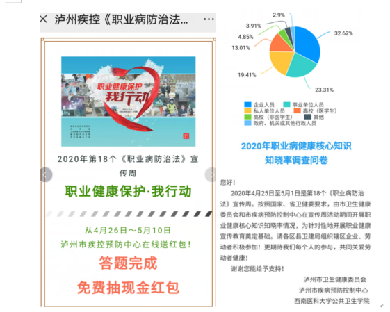 为了解泸州市不同人群对职业病危害及防护知识的知晓情况,同时也是为了向更多人群宣传职业病相关防护知识,在新冠疫情防控这个特殊时期,今年的宣传活动主要以线上为主,华人策略社区官网网址环境卫生与劳动卫生教研室结合专业特点,主动发挥专业优势,与市卫健委和市疾控中心共同制定了《泸州市2020年职业病健康核心知识知晓调查》问卷并制作成问卷星,采用微信APP方式,开展职业病防护相关知识的网络宣传和调查。