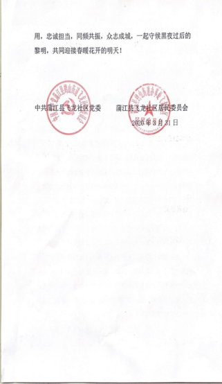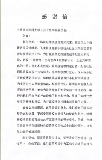 近日,江油市疾病预防控制中心、蒲江县飞龙社区居民委员会向我院发来表扬信,对我院2015级预防医学专业李宁、邵亚文、李鑫以及2019级食品卫生与营养学专业罗天天,四位同学积极响应号召,放弃休假,逆流而行,全力战“疫”的行为予以高度评价。