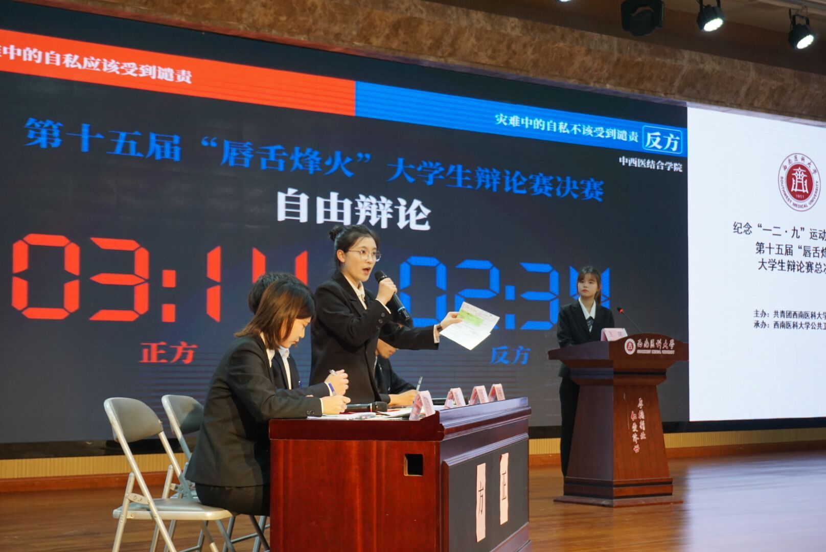 第一场“季军之争”辩论赛是由法学院对战中西医结合学院。他们的辩题是“灾难中的自私是否应该受到谴责”。认为“应该受到谴责”的正方在确定判指“谴责灾难中的自私是否有利于维护现行的社会道德秩序”后,用清晰的语言表达和临场应变能力多角度进行论证;认为“不应该受到谴责”的反方则定义自私行为是“追求自身和相关群体的利益”,引经据典、说理阐述。双方辩手时而慷慨陈词,时而冷静剖析,将辩题剖析得淋漓尽致。