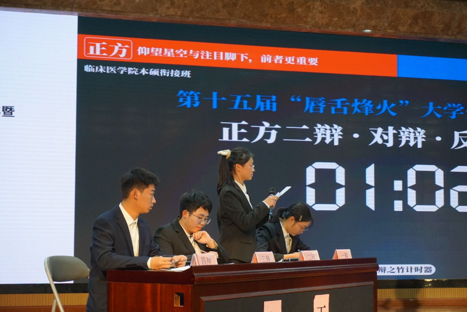 第二场“冠亚之争”辩论赛是由临床医学院本硕衔接班对战医学影像系。他们的辩题是“仰望星空与注目脚下,谁更重要”。在达成二者同样重要的共识后,正方以仰望星空“能够提供前行的方向和更为长期恒久的动力”为支撑点,不断展开攻势;反方则以精妙的譬喻与引用,从小我奋斗到国家政策,多方面进行攻防。双方辩手各执一词,极尽思虑之密,也力寻疏漏之机。