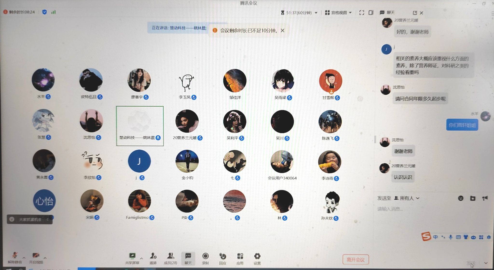 2023年12月18日上午10点,上海楚动智能科技有限公司西南大区总监姚林晨先生来我院开展线上招聘宣讲,学院学生科科长彭丽冰主持会议,30余名食品卫生与营养专业毕业生和低年级同学参加了此次线上招聘宣讲。