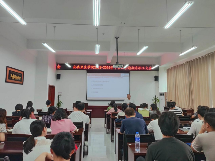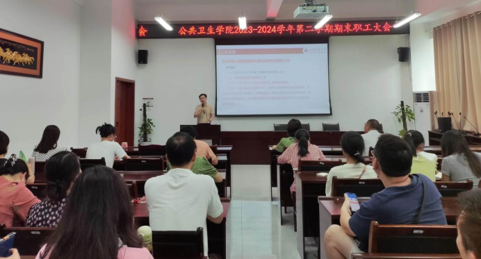为统一思想、明确方向,全面落实暑假各项工作,7月4日,我院2023-2024第二学年期末职工大会在仁济楼会议室召开。全体教职工参加了会议,院长马玲主持会议。
