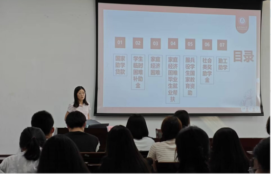 彭丽冰对贫困生认定办法、国家奖助学金、创先争优、社会类奖助学金、毕业生评优等政策进行了详尽的阐释。她不仅介绍了评优评先以及各项资助的申请条件、评审流程和发放标准,还通过具体案例,帮助学生更准确地理解政策内容。