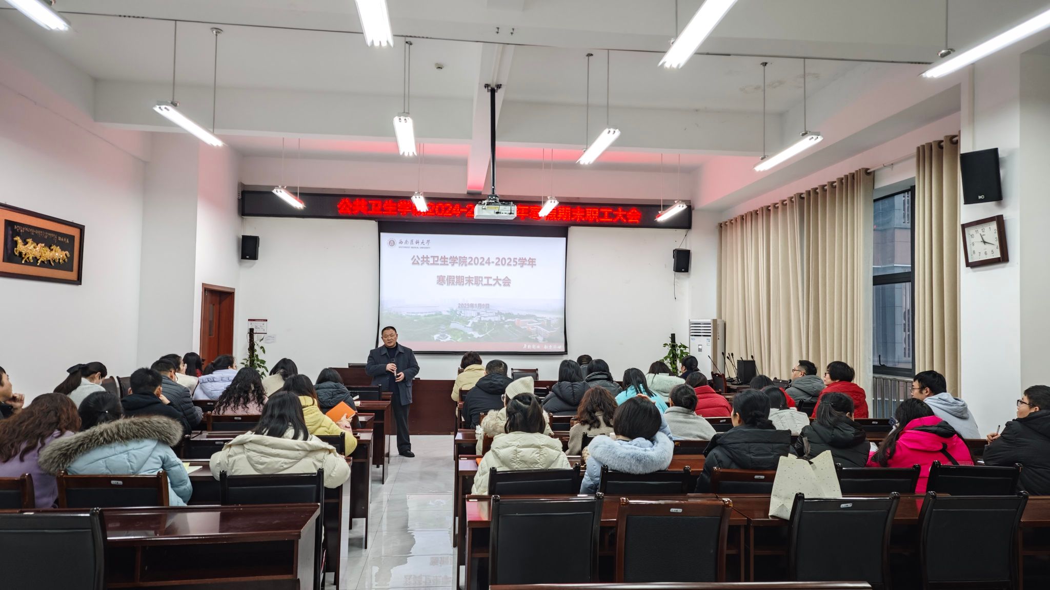 会上,副院长杨懿总结了本学期的教学工作,强调了日常教学管理的重点事项,并对本科毕业论文指导、公共卫生执业医师资格考试、教学竞赛和学生竞赛情况进行了说明。她还对2025年教育教学工作计划进行了初步展望,希望全体教师继续提升教学质量,积极参与教学改革与竞赛活动。