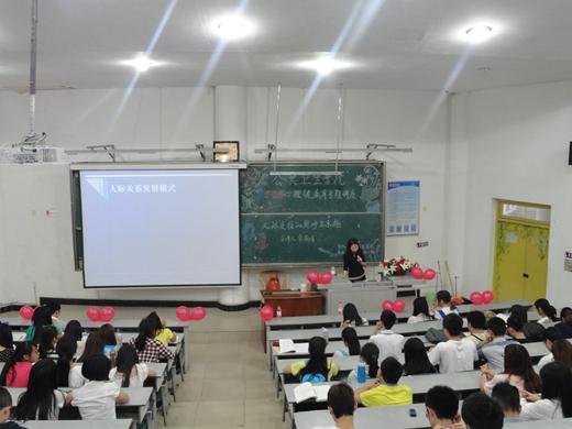 5月19日晚,华人策略社区官网网址“5•25”心理健康月之“人际交往的奥妙与乐趣”专题讲座在城北校区荟文楼教室举行。讲座由人文社科学院心理教研室宋丽娟老师主讲。我院2011、2012级全体同学聆听了讲座。