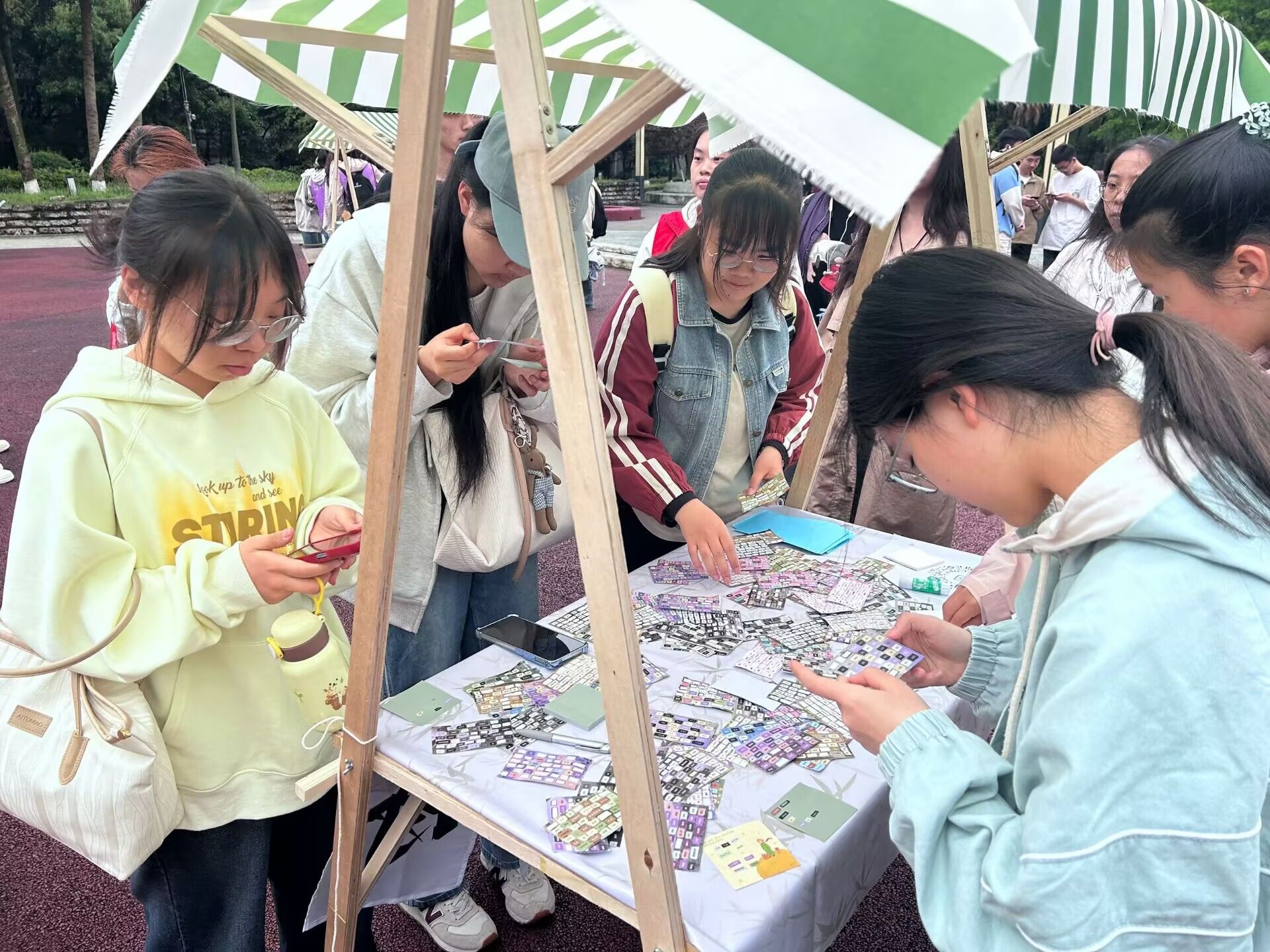 活动开始时,志愿者们被分配至多个区域开展工作。在游戏区,志愿者们耐心讲解规则、维持秩序,现场氛围热闹非凡。投壶、神笔马良、书本套套乐等闯关游戏吸引众多同学踊跃参与。市集体验区同样人气高涨,春日书签DIY、图书漂流、非遗漆扇等体验活动丰富多彩。志愿者们邀请同学们围坐在一起,分享喜爱的书籍,并组织读书交流活动。活动全程,志愿者们在现场巡逻,维护秩序,引导同学们文明参与,保障活动安全有序进行。活动结束后,志愿者还协助清理现场。