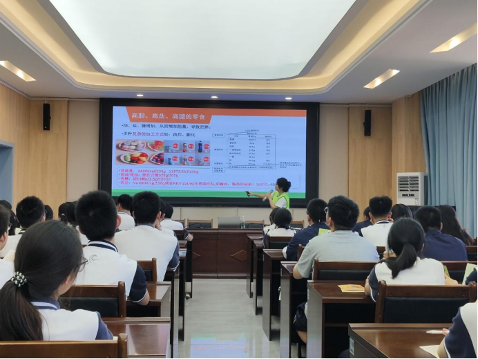 活动围绕“合理膳食,健康成长”主题展开。营火虫研究会会长陈银芝结合中学生生长发育特点,通过案例分析,讲解了营养素功能、食物营养成分及膳食搭配原则,重点解读《中国居民膳食指南(2022)》中“能量平衡”核心准则,强调高脂、高盐、高糖零食的危害,并指导如何通过食品标签识别“三高”零食。