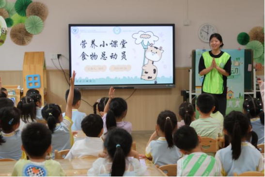 本次活动面对大班的小朋友们开展,在活动中,刘丹为小朋友们讲解了营养、合理膳食等方面的知识,并带领小朋友们用小卡片动手实践;黄婷婷为小朋友们展示科学小实验;引导小朋友们一起来做长高操等一系列趣味活动。这些活动向小朋友们生动地传递每天喝牛奶、吃五种蔬菜水果、多喝水、吃营养早餐及培养规律进餐的习惯,并且保证充足运动时间。小朋友们积极参与互动问答。