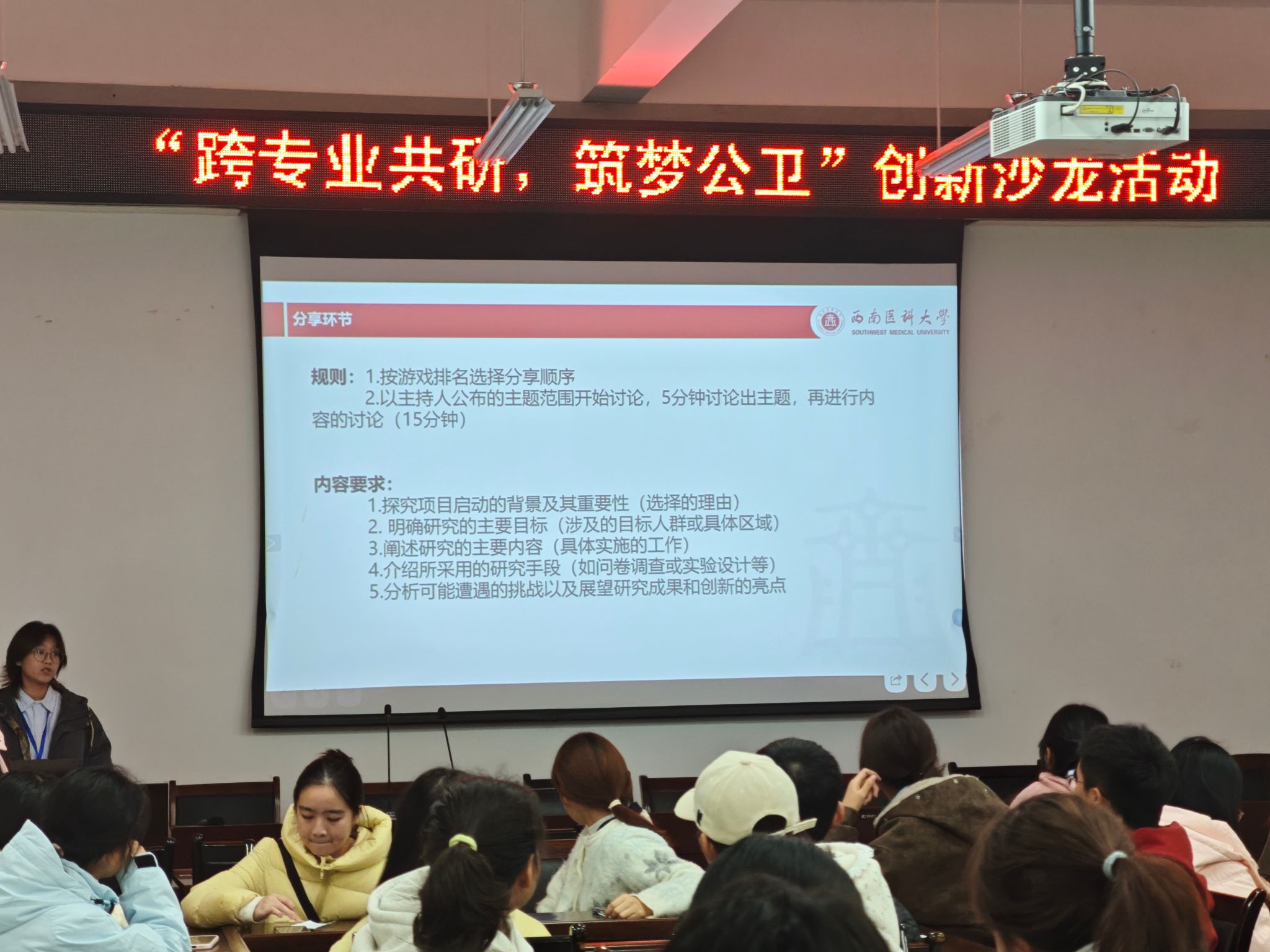 活动伊始,创新创业部副部长蒋春红详细介绍了活动目的与流程。在游戏环节中,同学们活力四射,激情满满。随后的分享环节中,不同专业的学生代表依次上台,围绕公共卫生领域的热点问题,结合自身专业视角展开深入探讨,分享了跨专业研究的思路与成果。最后分组讨论时,大家围绕“如何利用跨学科知识解决公共卫生难题”这一核心议题,积极交流想法,碰撞出智慧的火花,现场气氛热烈。