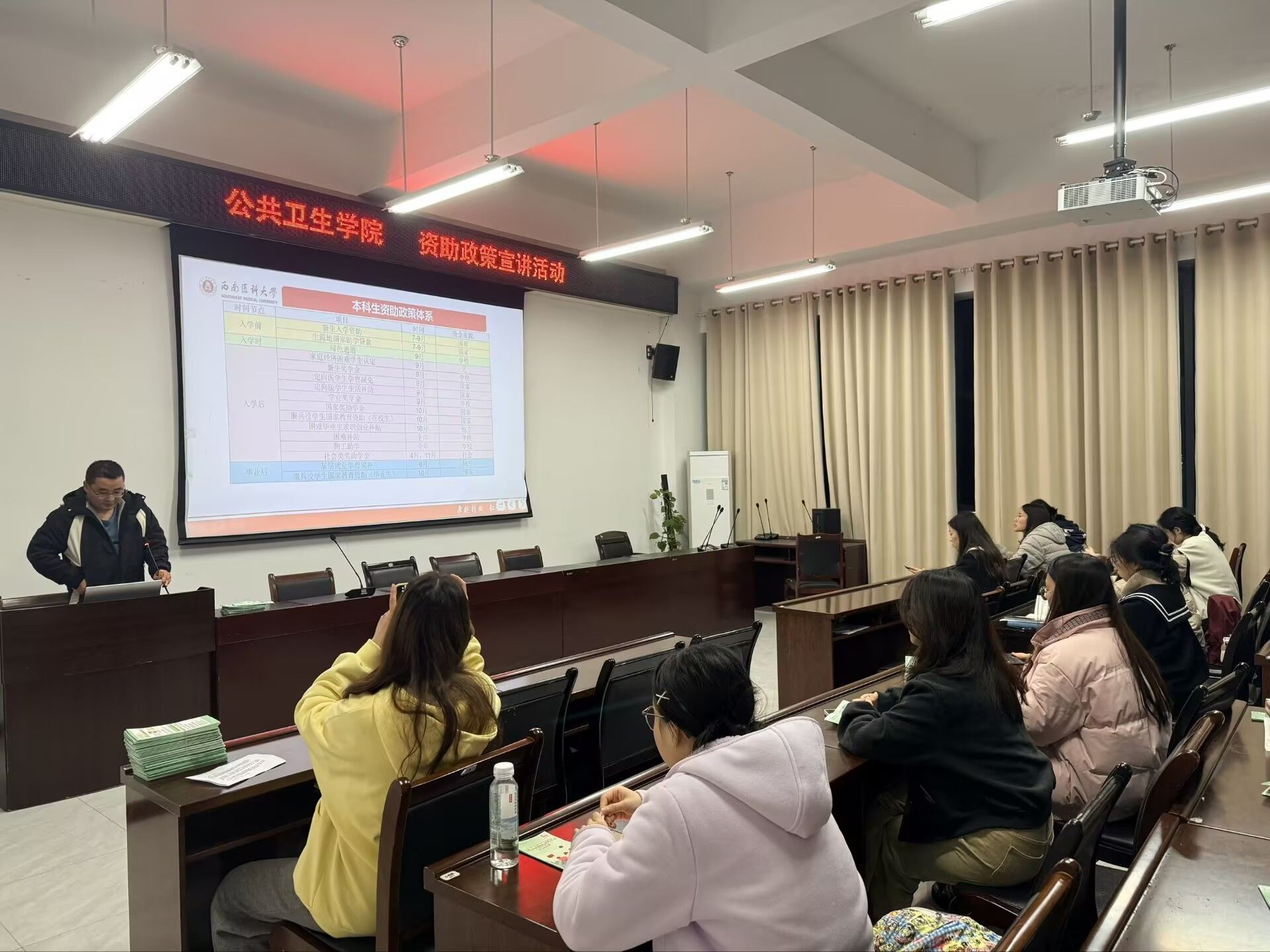 学院生活服务部负责人首先介绍了活动的背景与流程。随后,孙夫钦系统阐释了以“奖、助、贷、勤、补、免、偿”为核心的八位一体学生资助体系,并结合实际案例,重点讲解了新生入学资助、国家助学贷款、家庭经济困难认定、学业奖学金等项目的申请条件与具体流程。在互动环节中,同学们踊跃提问,孙夫钦一一予以细致解答,现场气氛融洽,交流深入。