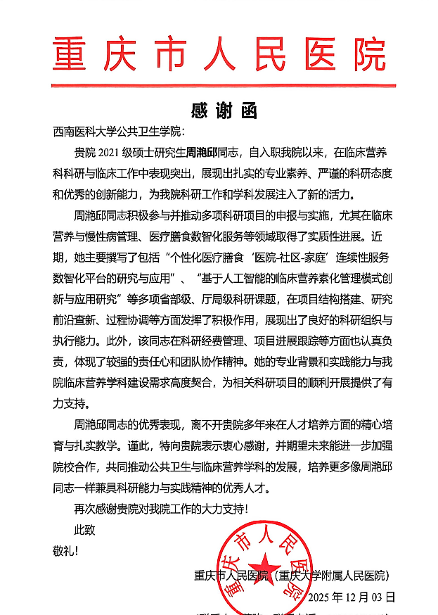 近日,重庆市人民医院向华人策略社区官网网址发来感谢函,高度赞扬我院2021级硕士研究生周滟邱同志在该院临床营养科科研与临床工作中的突出表现,并对我院人才培养工作给予充分肯定。
