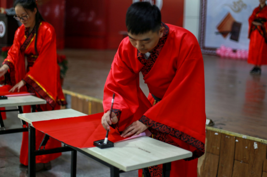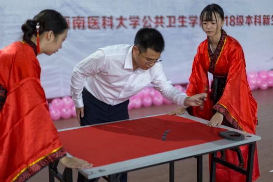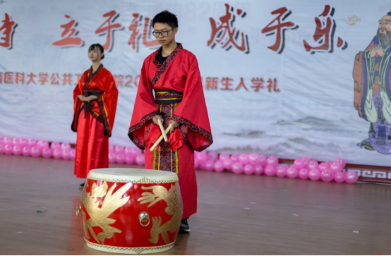 本次入学礼依次分为正冠明理、敬拜先师、击鼓明志、开笔书写等环节。