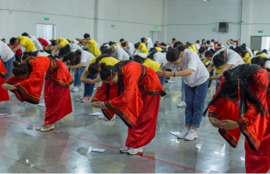 尊圣贤、敬师尊。全体学子向先师孔子行敬拜礼,向现场的各位师长行礼。