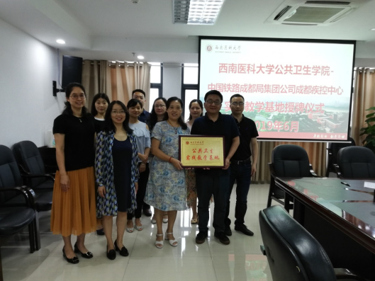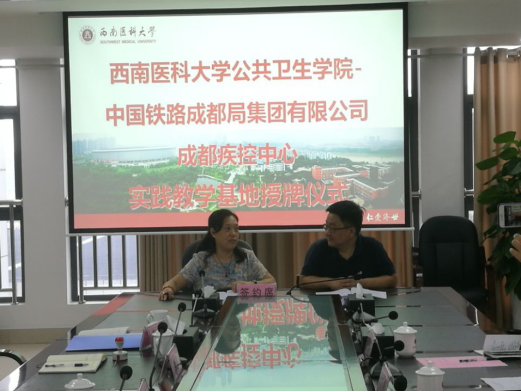 6月11日下午,华人策略社区官网网址-中国铁路成都局集团公司成都疾控中心(以下简称成都铁路疾控中心)实践教学基地授牌仪式在德成楼521举行。成都铁路疾控中心所长沈捷、副所长何世军、劳动人事教育科科长涂晓玲、业务科副科长胡静,华人策略社区官网网址党政领导和相关科室负责人等参加了授牌仪式。