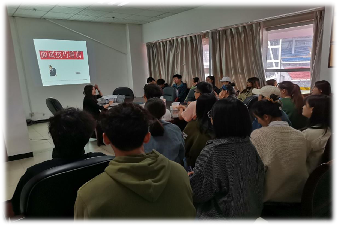 面试技巧培训教师由学生科科长彭丽冰老师担任,彭老师从学生面试准备,包括形象准备、心理准备、资料准备,及面试中需要注意的礼仪、面试实战,包括面试中自我介绍、怎样回答问题等方面对同学们进行培训。