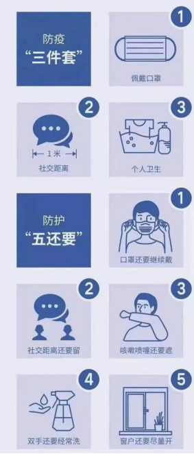 1.严格遵守当地政府防疫要求,在思想上行动上决不能有丝毫侥幸和松懈;尽量减少到人员密集场所,不出国、出境,不到疫情中高风险地区,非必要不出川。时刻牢记防疫“三件套”和防护“五还要”。