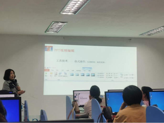培训会上,教育技术科副科长王静首先介绍了信息与教育技术中心教育技术科的基本情况;随后,韩淑珍为大家讲解PPT制作的标准和基本要求,余红莲从色彩和主题两个方面讲解了PPT制作配色要求,孙洪艳针对PPT课件制作过程中视频制作进行讲解;最后,老师们针对教学PPT课件制作中设计、配色和视频制作中容易出现的问题进行了交流。