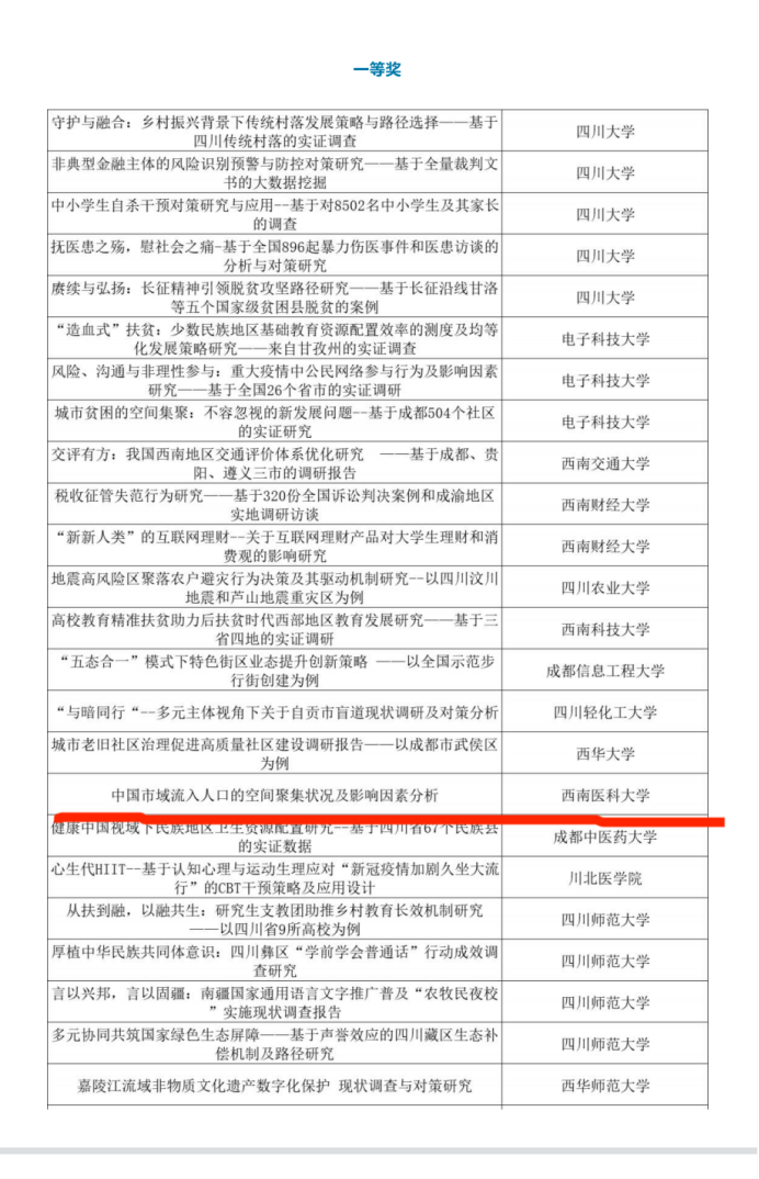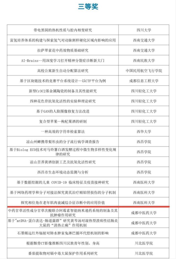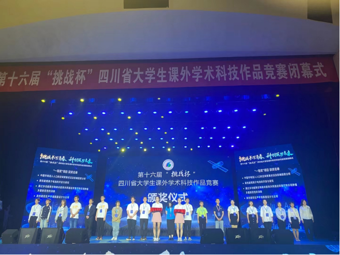 5月22-24日,第十六届“挑战杯”四川省大学生课外学术科技作品竞赛终审决赛在四川师范大学成龙校区举行。本届大赛由共青团四川省委、省委组织部、省科协、教育厅、省社科院、科技厅、人力资源社会保障厅和省学联联合主办。经过网络初评、线下问辩、专家讨论,我校报送的15项作品全部获奖,共荣获一等奖1项、二等奖4项、三等奖10项。由我院学生2017级预防医学张勇进等同学创作,张俊辉等老师指导的作品《中国市域流入人口的空间聚集状况及影响因素分析》喜获哲学社会科学类一等奖,并将被四川省推报参加国赛。由本科2018级预防医学宋雨同学创作,贾红教授指导的作品《探究相位角在老年肌肉衰减综合征诊断中的应用价值》荣获自然科学类三等奖。