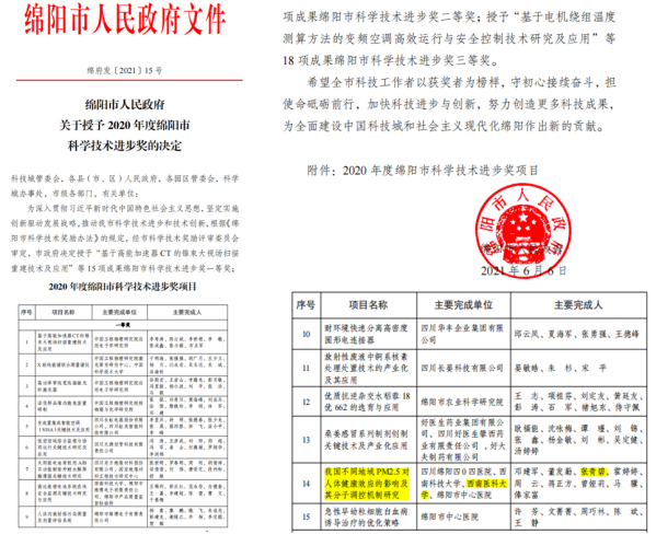近日获悉,由我校华人策略社区官网网址环境与劳动卫生教研室张青碧教授团队与绵阳四0四医院、西南科技大学等共同合作的项目“我国不同地域 PM2.5对人体健康效应的影响及其分子调控机制研究”获绵阳市人民政府科学技术进步一等奖。