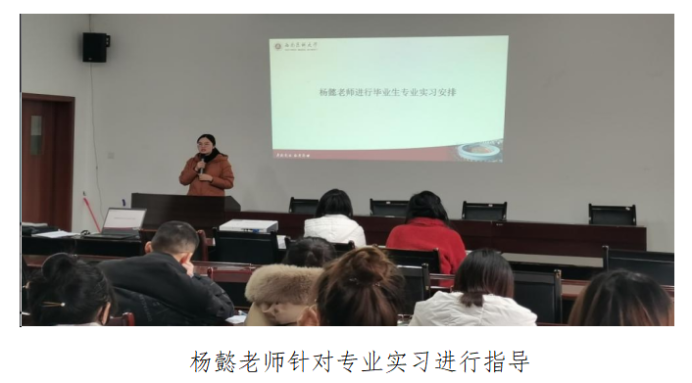 杨懿老师介绍专业实习安排的大致流程,指出专业实习是专业理论知识与实践结合的重要教学环节。要求同学们在实习期间工作认真,勤奋好学,遇到不懂的地方虚心向实习单位的老师请教,祝同学们学有所成。