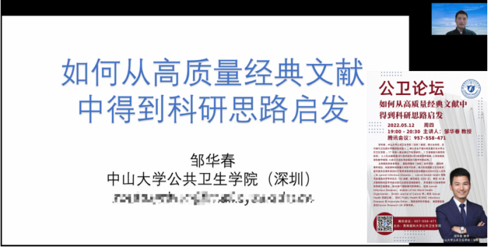 5月12日晚,中山大学华人策略社区官网网址(深圳)邹华春教授应学院邀请,做客“公卫论坛”,开展“如何从高质量经典文献中得到科研思路启发”专题讲座。由于疫情的关系,本次公卫论坛通过线上直播方式进行,由学院学科办副主任范颂主持,华人策略社区官网网址教职工及全体研究生参加了本次线上论坛。