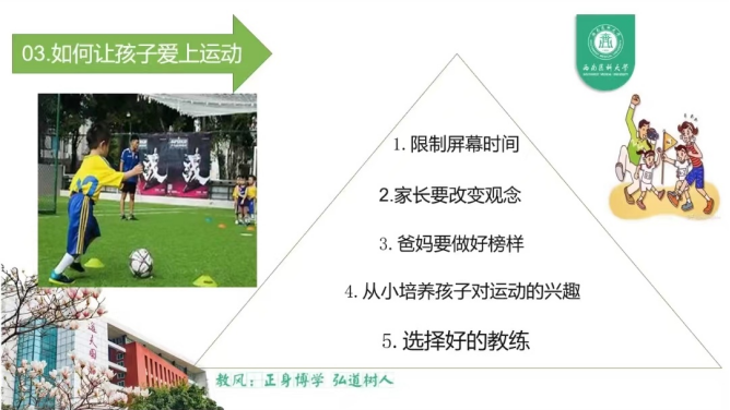 5月20日晚19:00,华人策略社区官网网址华人策略社区官网网址营养与食品卫生教研室副主任、中国注册营养师杨艳老师和华人策略社区官网网址体育学院运动训练学博士左彬老师出席讲座。以“知营养 会运动”为主题,向泸州市江阳区、龙马潭区公立初中及小学学生家长讲解学龄儿童营养知识,并加强对学龄期儿童体质健康重要性的宣传,共同提高泸州市学龄儿童体育与健康素养,增强体质健康管理的意识和能力。